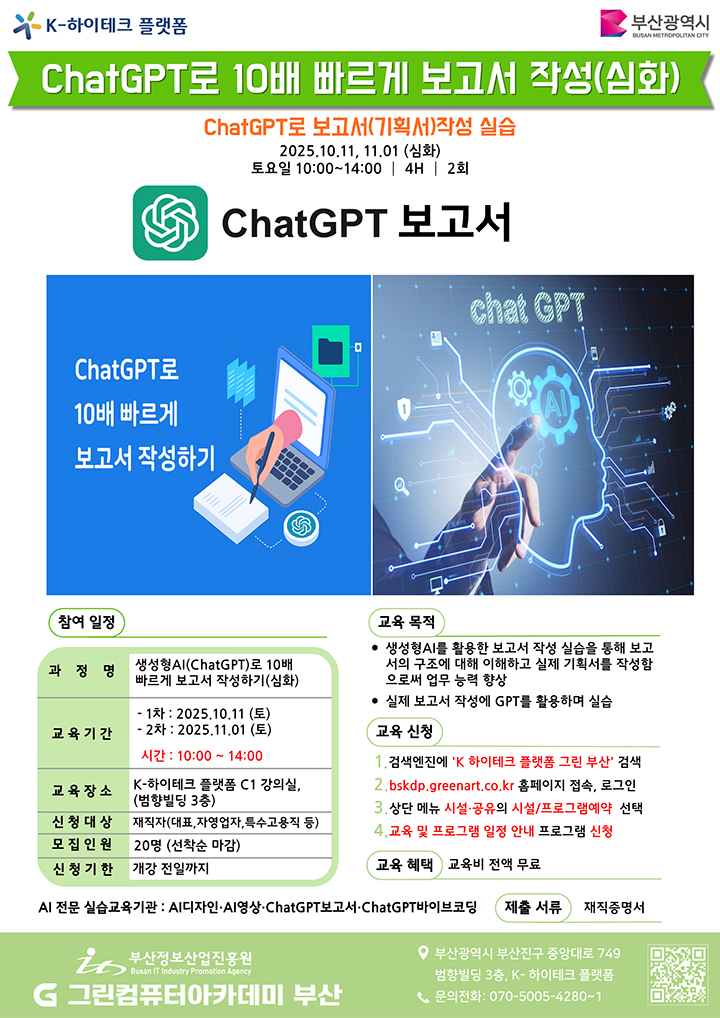※출석인정을 위해 고용24 출결관리 어플 설치 필요 설치방법: https://bskdp.greenart.co.kr/kdp/kdp_noticeview.html?no=142 부산시 재직자 무료교육 / 부산시 재직자 무료수업 / 부산 재직자 무료교육 / 부산 재직자 무료수업 / 부산 AI 무료 수업 / 부산 AI 무료 교육 / 미드저니 무료 교육 / 미드저니 무료 사용법 / 미드저니 AI 사용법 / Midjourney ai 사용법 / Midjourney 무료 사용법 / 캡컷 무료 교육 / 캡컷 무료 사용법 / 캡컷 ai 사용법 / Capcut 무료 교육 / Capcut 사용법 / 영상편집 / 영상제작 / ai 영상제작 / ai 영상편집 / 피그마 무료 교육 / figma 무료 교육 / figma 사용법 / chatgpt / 챗지피티 사용법 / 챗지피티 무료교육 / 프리미어 / 프리미어 사용법 / 상품 페이지 / 템플릿 / 상세페이지 / 포스터 / 보고서 작성 / 바이브코딩 / 10배 빠르게 첨부파일