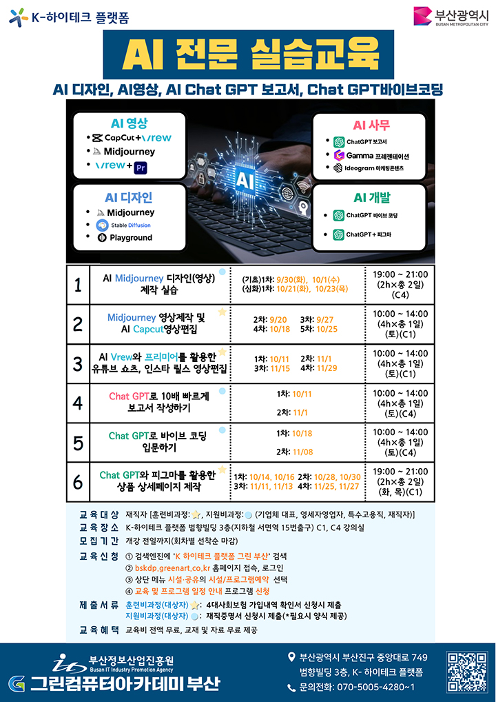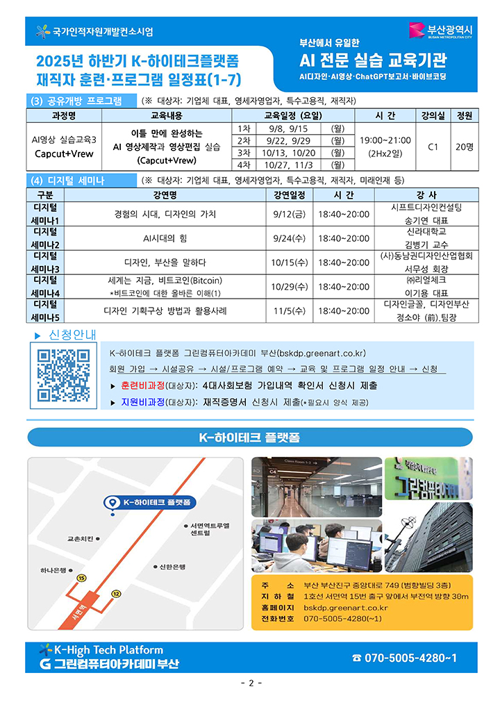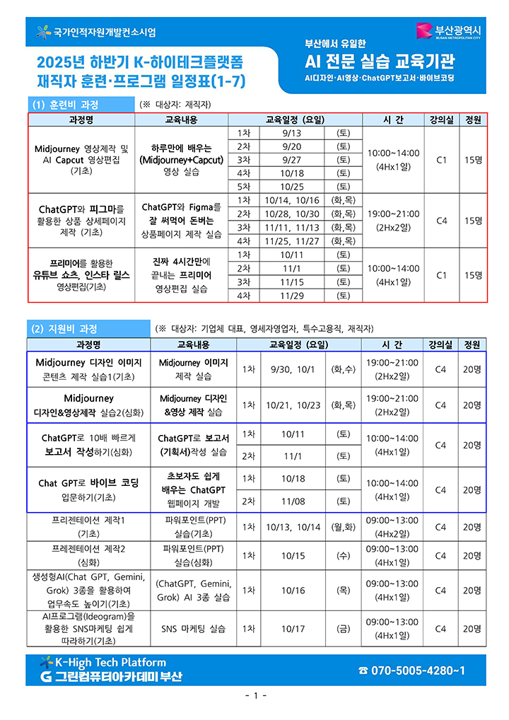 <2025년 하반기 KHP 무료 훈련 일정 안내> 2025년 그린컴퓨터아카데미 부산 K-하이테크 플랫폼의 하반기 재직자 훈련, 프로그램의 일정을 안내드립니다. 하단의 이미지 또는 첨부파일을 참고해주시길 바랍니다. 참고하여 많은 참여 부탁드립니다.