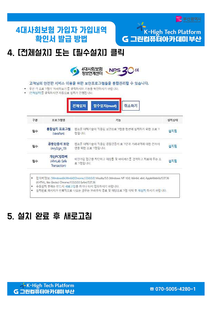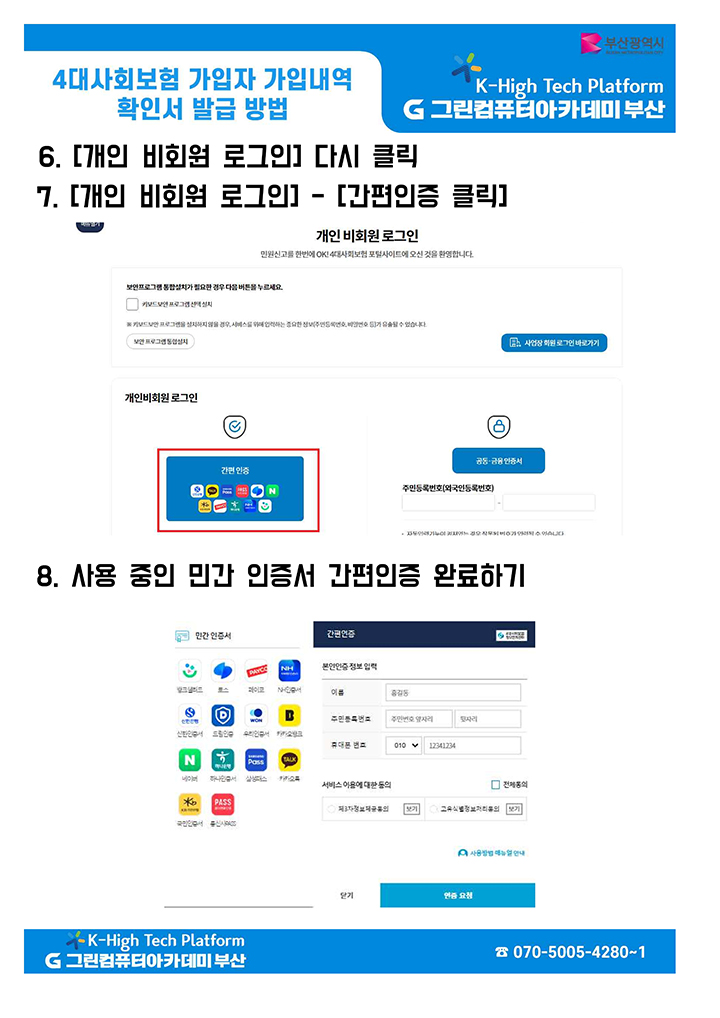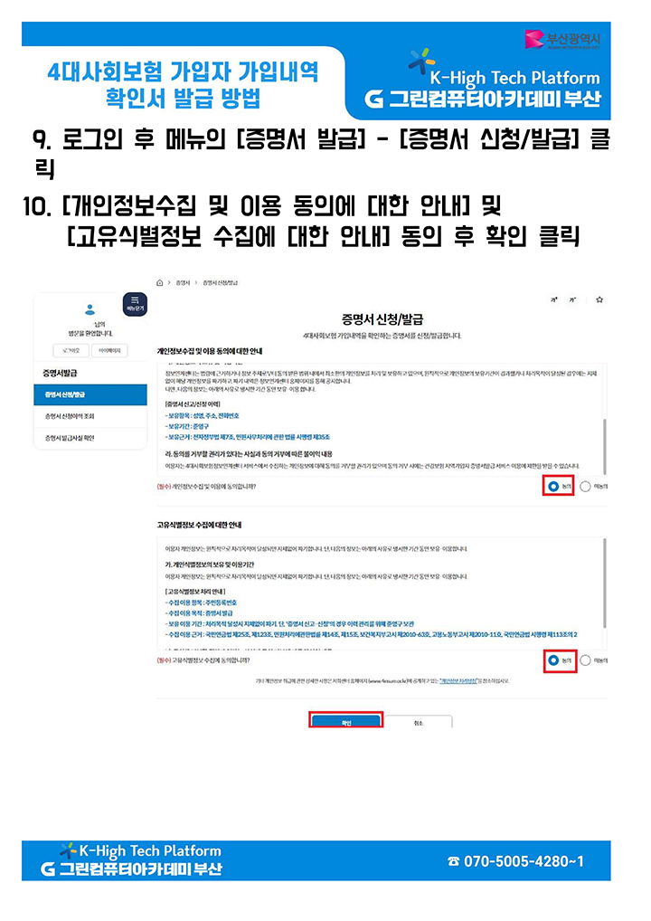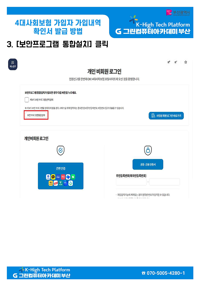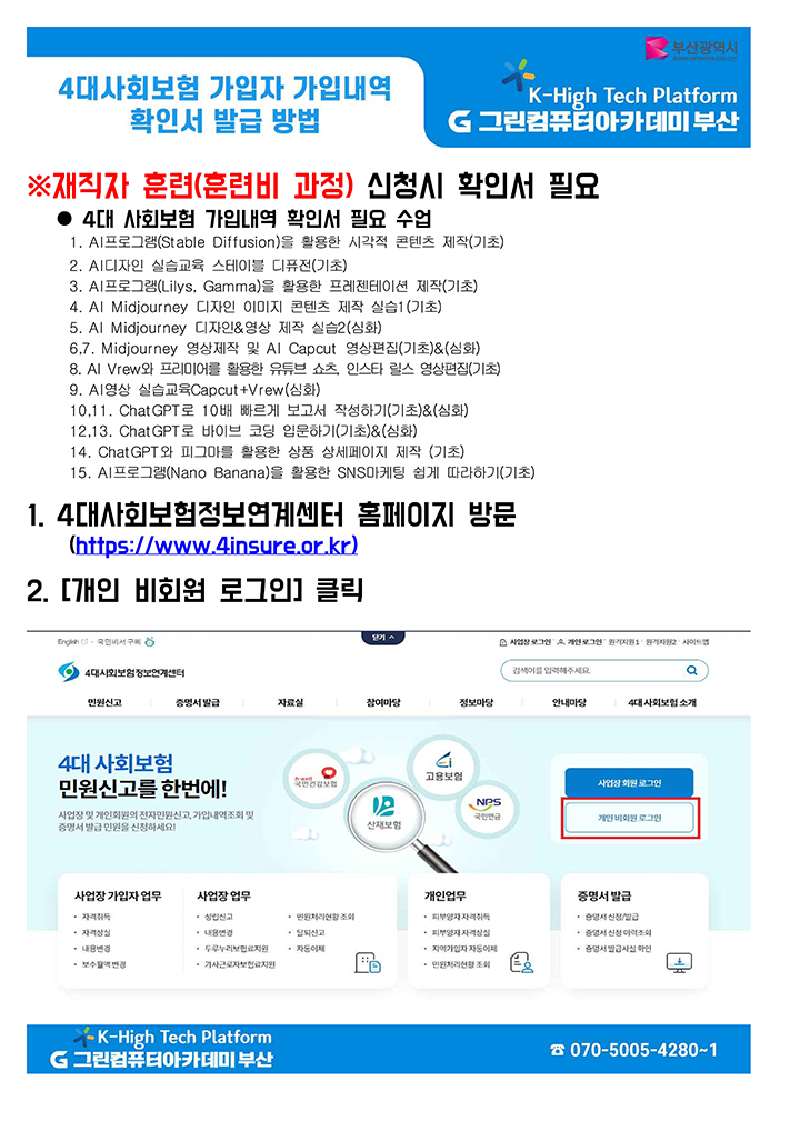 4대사회보험 가입자 가입내역 확인서 발급방법입니다. 구체적 발급 방법은 하단의 이미지 또는 첨부파일을 참고해주시길 바랍니다. AI프로그램 무료교육(재직자 대상 훈련비 과정) 신청시 확인서가 필요하니 제출해주시면 감사하겠습니다.