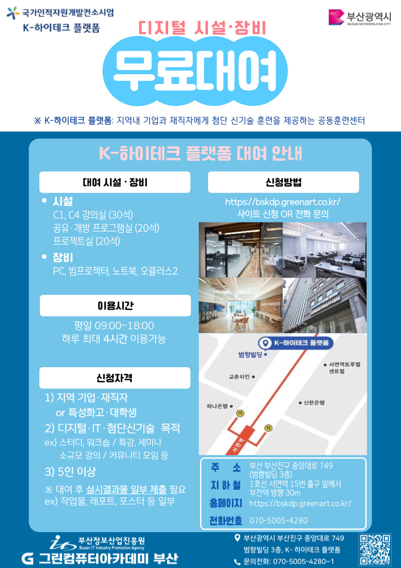 2026년 그린컴퓨터아카데미 부산 K-하이테크 플랫폼의 디지털 시설·장비 무료대여를 안내드립니다. 하단의 이용시간 및 신청자격을 확인하여 많은 신청 부탁드립니다. ☎문의전화: 070-5005-4280☎문자, 카톡: 010-3941-7128![]()