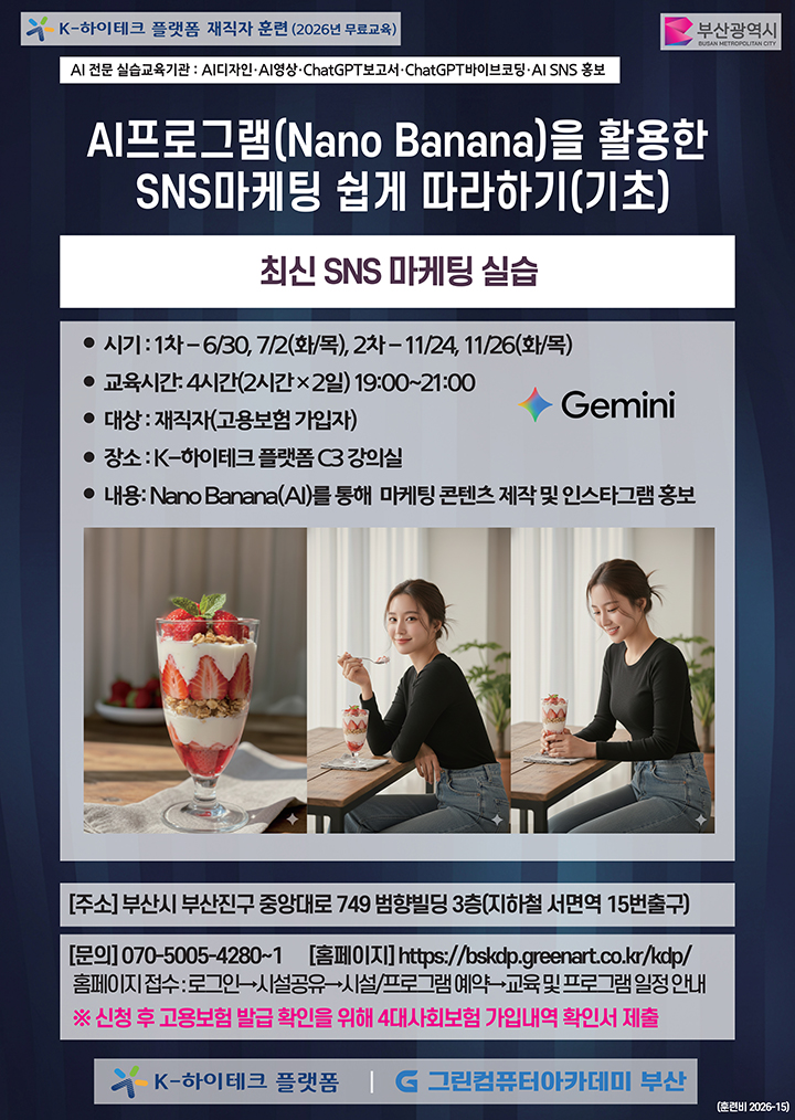 | [2026 재직자 무료교육] AI프로그램(Nano Banana)을 활용한 SNS마케팅 쉽게 따라하기(기초) (훈련비과정) | 관리자 | 2025-12-12 | |||||||||||||||