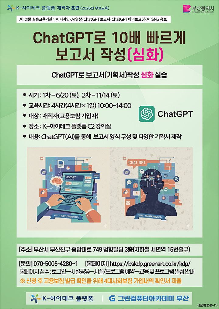 ※출석인정을 위해 고용24 출결관리 어플 설치 필요 설치방법:https://bskdp.greenart.co.kr/kdp/kdp_noticeview.html?no=142 부산시 재직자 무료교육 / 부산시 재직자 무료수업 / 부산 재직자 무료교육 / 부산 재직자 무료수업 / 부산 AI 무료 수업 / 부산 AI 무료 교육 / 미드저니 무료 교육 / 미드저니 무료 사용법 / 미드저니 AI 사용법 / Midjourney ai 사용법 / Midjourney 무료 사용법 / 캡컷 무료 교육 / 캡컷 무료 사용법 / 캡컷 ai 사용법 / Capcut 무료 교육 / Capcut 사용법 / 영상편집 / 영상제작 / ai 영상제작 / ai 영상편집 / 피그마 무료 교육 / figma 무료 교육 / figma 사용법 / chatgpt / 챗지피티 사용법 / 챗지피티 무료교육 / 프리미어 / 프리미어 사용법 / 상품 페이지 / 템플릿 / 상세페이지 / 포스터 / 보고서 작성 / 바이브코딩 / 10배 빠르게 / 프레젠테이션 제작/ gemini / grok / sns마케팅 / ideogram / 인스타 / 트위터 / x /페이스북 |