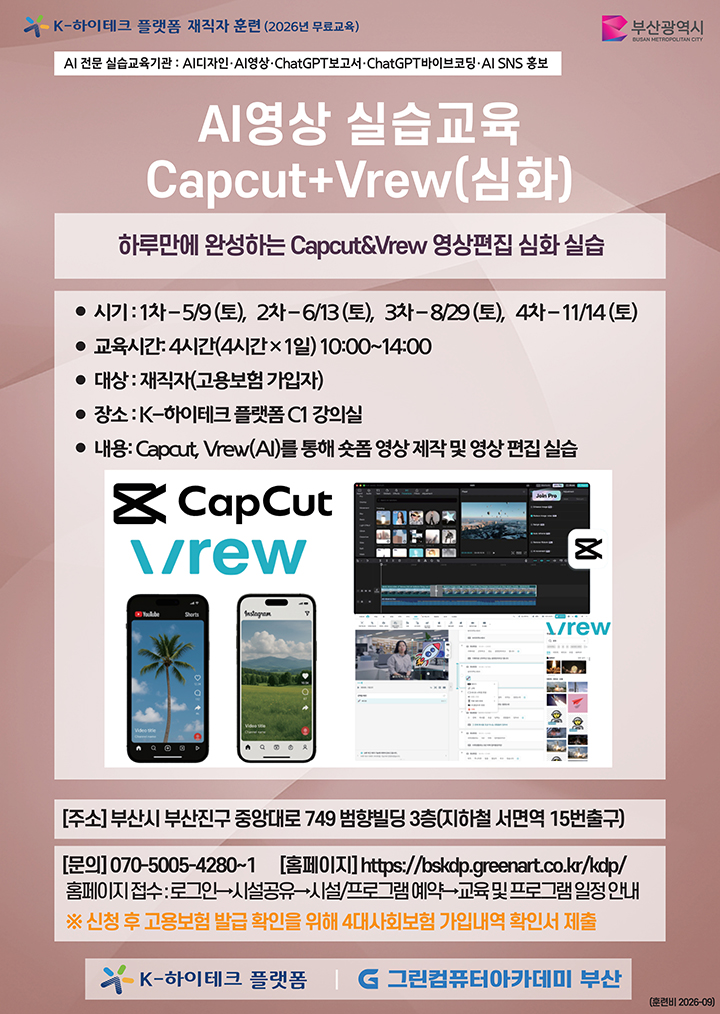| [2026 재직자 무료교육] AI영상 실습교육 Capcut+Vrew(심화) (훈련비과정) | 관리자 | 2025-12-12 | |||||||||||||||||||||||||