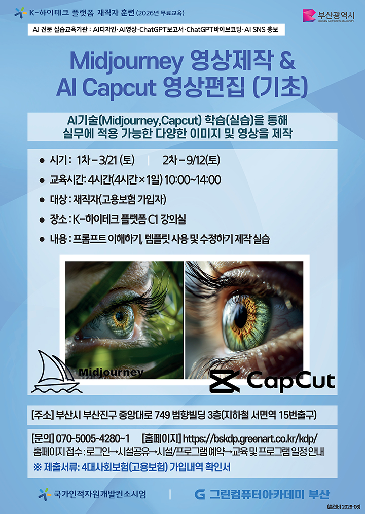 ※출석인정을 위해 고용24 출결관리 어플 설치 필요 설치방법:https://bskdp.greenart.co.kr/kdp/kdp_noticeview.html?no=142 부산시 재직자 무료교육 / 부산시 재직자 무료수업 / 부산 재직자 무료교육 / 부산 재직자 무료수업 / 부산 AI 무료 수업 / 부산 AI 무료 교육 / 미드저니 무료 교육 / 미드저니 무료 사용법 / 미드저니 AI 사용법 / Midjourney ai 사용법 / Midjourney 무료 사용법 / 캡컷 무료 교육 / 캡컷 무료 사용법 / 캡컷 ai 사용법 / Capcut 무료 교육 / Capcut 사용법 / 영상편집 / 영상제작 / ai 영상제작 / ai 영상편집 / 피그마 무료 교육 / figma 무료 교육 / figma 사용법 / chatgpt / 챗지피티 사용법 / 챗지피티 무료교육 / 프리미어 / 프리미어 사용법 / 상품 페이지 / 템플릿 / 상세페이지 / 포스터 / 보고서 작성 / 바이브코딩 / 10배 빠르게 / 프레젠테이션 제작/ gemini / grok / sns마케팅 / ideogram / 인스타 / 트위터 / x /페이스북 |