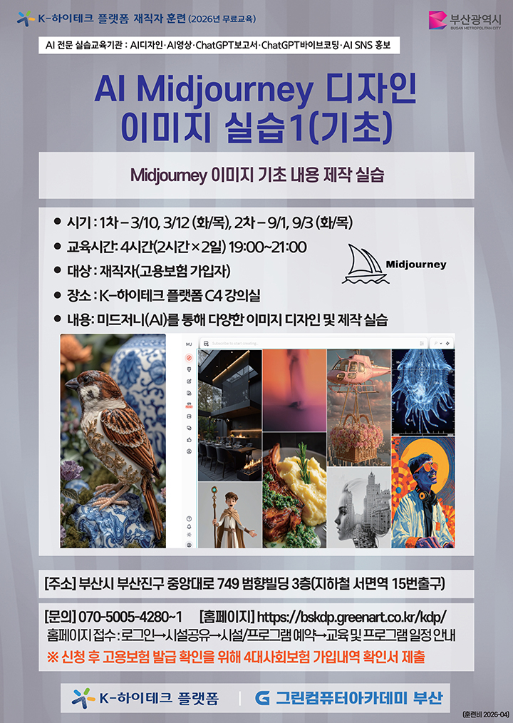 | [2026 재직자 무료교육] AI Midjourney 디자인 이미지 콘텐츠 제작 실습(기초) (훈련비과정) | 관리자 | 2025-12-12 | |||||||||||||||