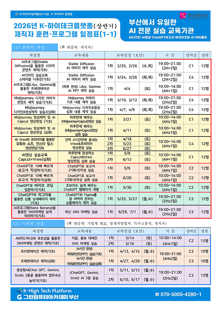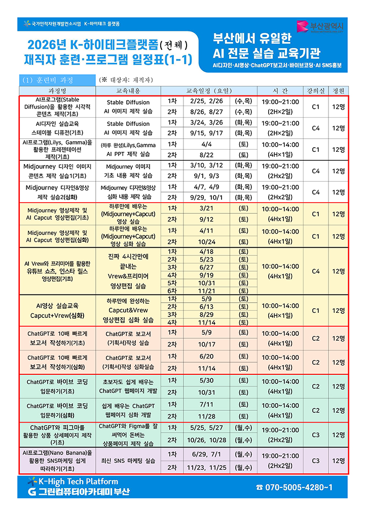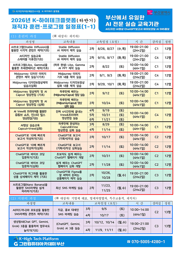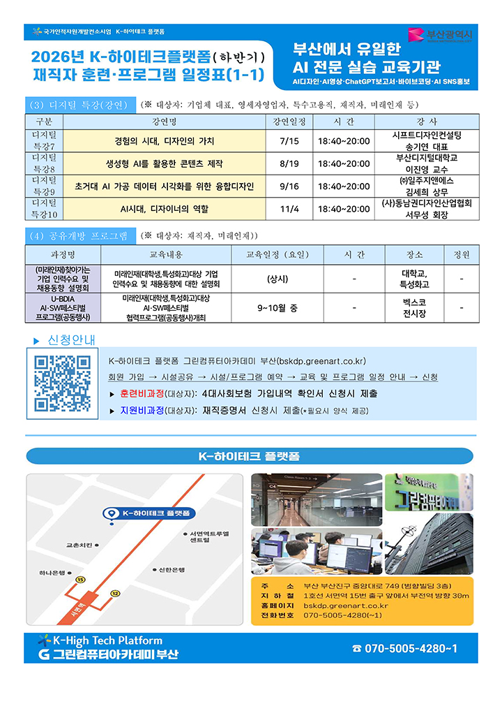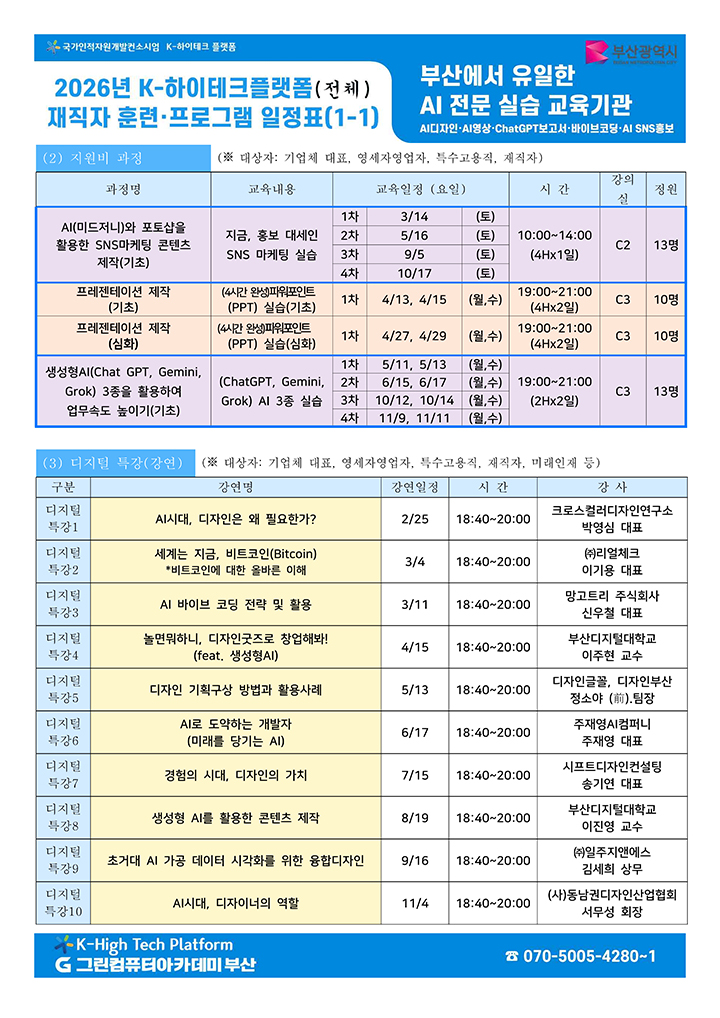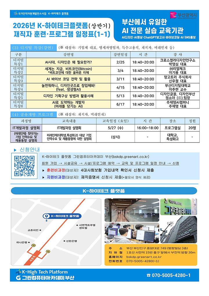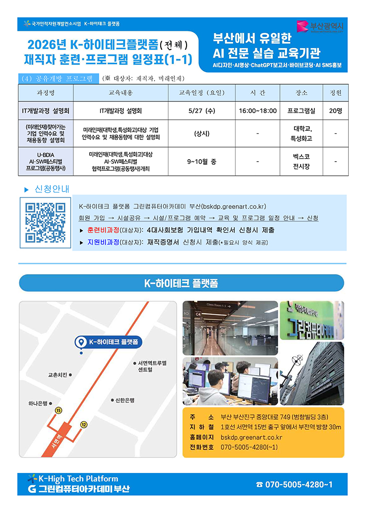 2026년 그린컴퓨터아카데미 부산 K-하이테크 플랫폼의 재직자 훈련, 공유개방 프로그램의 일정을 안내드립니다. 하단의 이미지 또는 첨부파일을 참고해주시길 바랍니다. 참고하여 많은 참여 부탁드립니다.