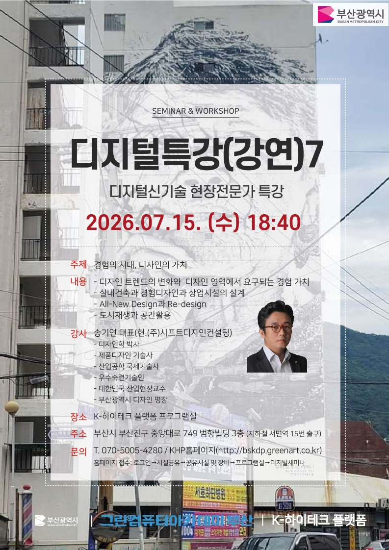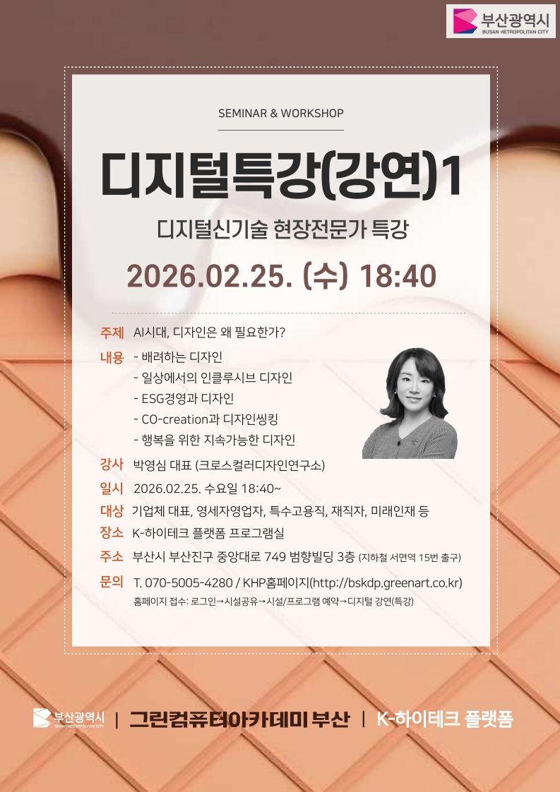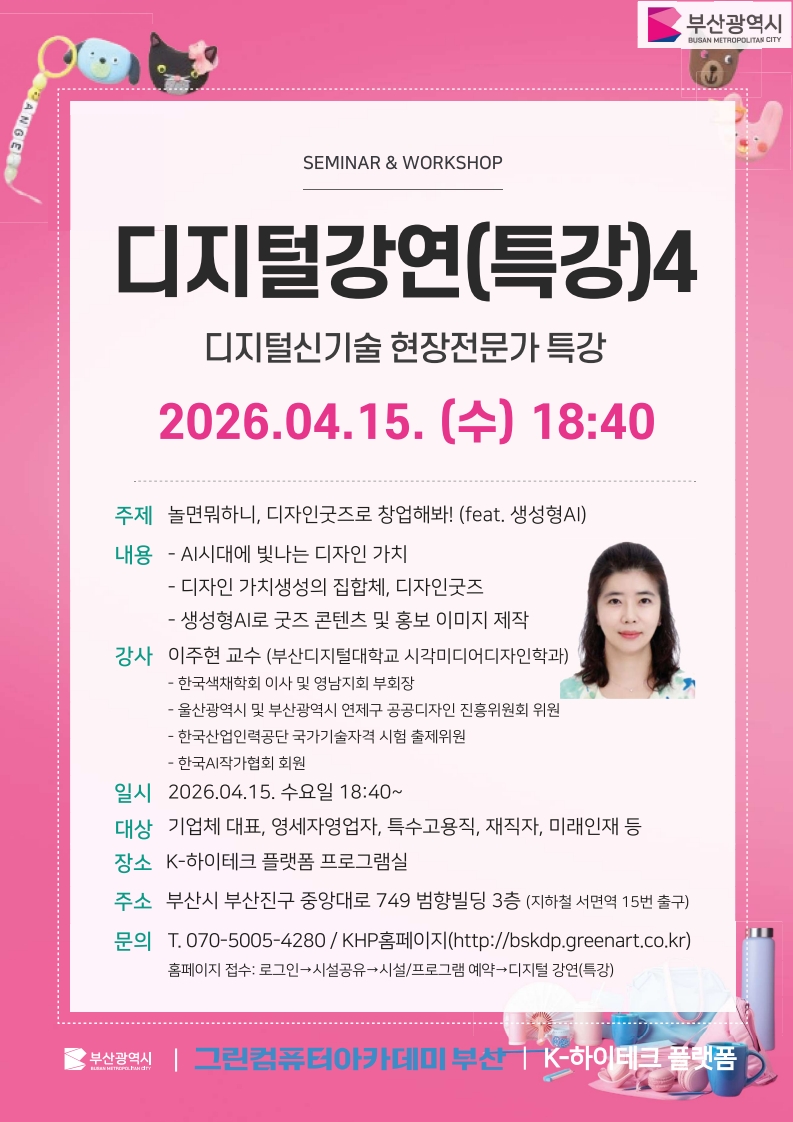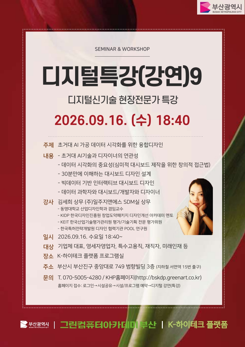 ■ 교육대상: 기업체대표,영세자영업자,특수고용직,재직자,미래인재 등 ■ 교육신청: (1) ‘K-하이테크 플랫폼 그린컴퓨터아카데미 부산’ 사이트 가입 및 로그인 (2) 상단 메뉴 시설공유의 시설/프로그램예약 선택 (https://bskdp.greenart.co.kr/kdp/kdp_reservation.html) (3) 교육 및 프로그램 일정 안내에서 프로그램 신청 ■ 교육장소: 부산광역시 부산진구 중앙대로 749, 범향빌딩 3층(지하철 서면역 15번출구) ■ 교육혜택: 교육비 전액 무료, 교재·자료 무료 제공 ■ 문의전화: 070-5005-4280~1