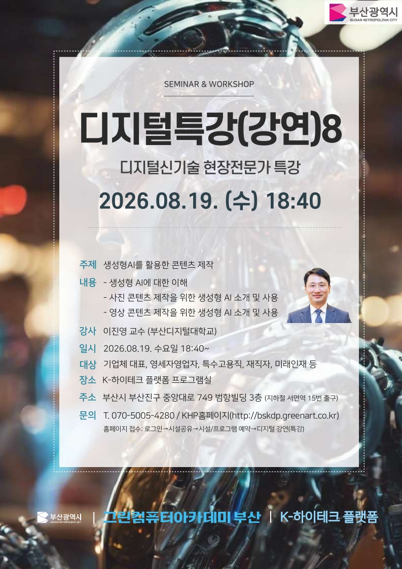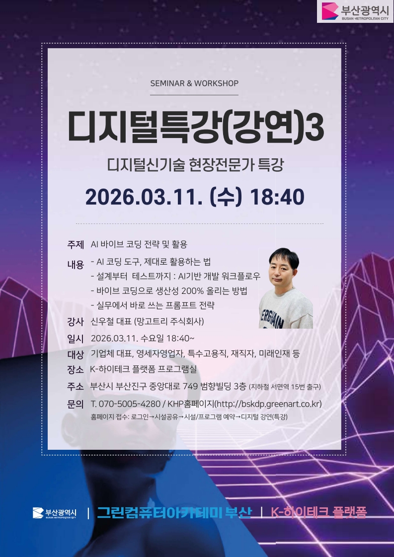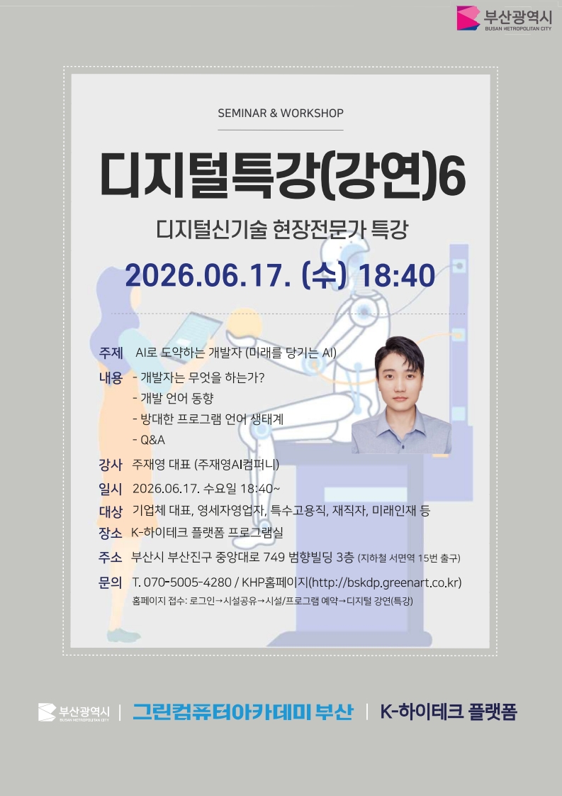 부산 무료교육 / 부산 K 하이테크 플랫폼 / 부산 개발 강의 / 부산 개발 특강 / 부산 개발 세미나 / 부산 IT 특강 / 부산 IT 세미나 / IT 무료 특강 / IT 무료 세미나 / 개발 무료 특강 / 개발 무료 세미나 / 개발 무료 교육 / IT 무료 교육 |